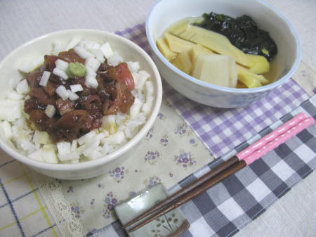 筍の若竹煮。筍と新鮮なワカメ。中トロのアラが安く手に入ったので