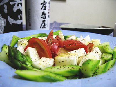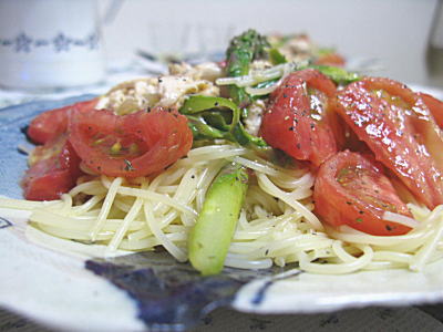 あ、写真は日曜の昼飯。トマトとアスパラとささみを合えたカペリーニですよ。