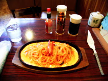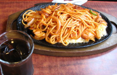 ナポリタンと頼むと、たいていはこういう鉄板の上にやかれたものが出てきます。